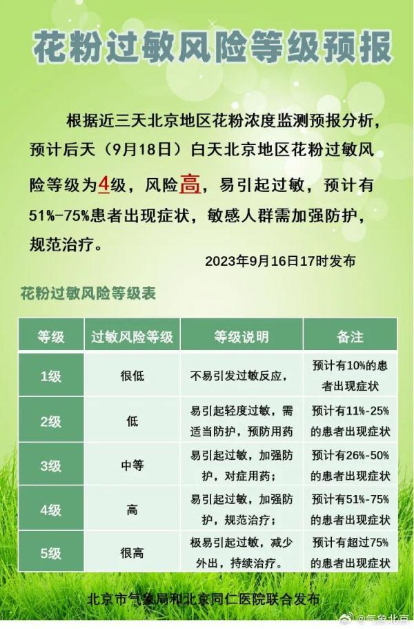 根據(jù)近三天北京地區(qū)花粉濃度監(jiān)測預(yù)報分析,預(yù)計后天(9月18日)白天北京地區(qū)花粉過敏風(fēng)險等級為4級,風(fēng)險高,易引起過敏,預(yù)計有51%-75%患者出現(xiàn)癥狀,敏感人群需加強防護,規(guī)范治療。