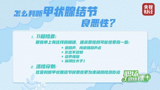 判斷甲狀腺結節良惡性更為準確的檢測方法是活檢穿刺 ,也就是在超聲引導下,用一根很細的穿刺針,經皮膚進入甲狀腺結節,吸取結節的部分細胞進行檢測。