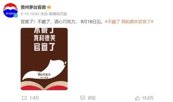 茅臺與瑞幸聯名的“醬香咖啡”引發的現象級熱度還未消散,茅臺很快又官宣了下一位“新歡”:9月14日,德芙、貴州茅臺官方微博相繼宣布,將在9月16日推出茅小凌酒心巧克力新品。
