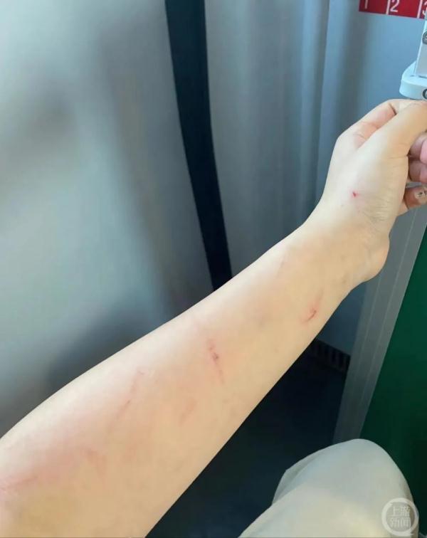 李女士告訴記者,后來(lái)發(fā)生爭(zhēng)執(zhí),是因?yàn)楹蠓脚臃浅S昧Φ赝妻∽腊濉!八奈恢檬窃谖业暮蠓剑晕业囊巫影l(fā)生了劇烈的震蕩,這個(gè)行為從我上車(chē)到事發(fā)已經(jīng)有至少3到4次。我當(dāng)時(shí)在休息,回頭提醒她說(shuō)‘您能別動(dòng)了嗎’?她就開(kāi)始辱罵我,之后還擊打我的左臂。我被打后準(zhǔn)備用手機(jī)來(lái)取證,她就把我的手機(jī)打掉了,又鉗制住我的雙臂,抓撓拍打。同行的人也打了我。”