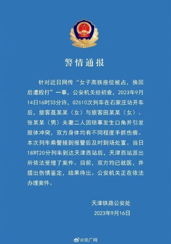 9月16日,北京鐵路公安局天津公安處發(fā)布警情通報(bào):針對(duì)近日網(wǎng)傳“女子高鐵座位被占,換回后遭毆打”一事,公安機(jī)關(guān)經(jīng)初查,2023年9月14日16時(shí)33分許,G2610次列車(chē)在石家莊站開(kāi)車(chē)后,旅客聶某某(女)與旅客田某某(女)、張某某(男)夫妻二人因瑣事發(fā)生口角并引發(fā)肢體沖突,雙方身體均有不同程度手抓傷痕。本次列車(chē)乘警接到報(bào)警后及時(shí)到場(chǎng)處置。當(dāng)日18時(shí)20分列車(chē)到達(dá)天津西站后,天津西站派出所依法受理了案件。目前,雙方均已就醫(yī),并提出傷情鑒定,結(jié)果待出。公安機(jī)關(guān)正在依法辦理案件。