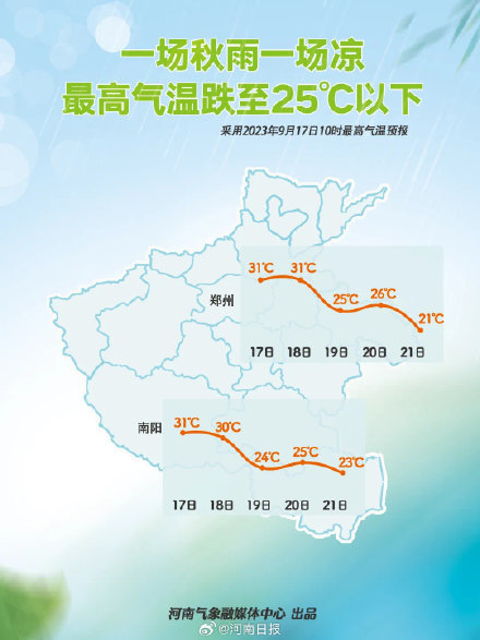 前方冷暖氣流“交鋒”,河南即將體驗“一場秋雨一場涼”!18-21日“大風+降雨+降溫”悉數登場,預計21日起,全省大部最高氣溫將不足25℃,最低氣溫僅有15℃上下。是該秋裝登場的時候啦! 其中,19日是強降水集中時段,全省陰天,有小到中陣雨、雷陣雨,西南部、南部、東部部分縣市有大到暴雨,局部大暴雨,伴有短時強降水、短時大風等強對流天氣。(河南氣象)