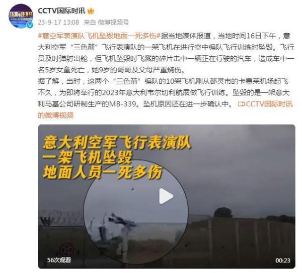 據當地媒體報道,當地時間16日下午,意大利空軍“三色箭”飛行表演隊的一架飛機在進行空中編隊飛行訓練時墜毀。飛行員及時彈射出艙,但飛機墜毀時飛濺的碎片擊中一輛正在行駛的汽車,造成車中一名5歲女童死亡,她9歲的哥哥及父母嚴重燒傷。