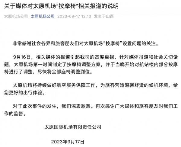央視網(wǎng)消息:據(jù)“太原機(jī)場公司”公眾號(hào)消息,太原國際機(jī)場就媒體對(duì)太原機(jī)場“按摩椅”相關(guān)報(bào)道發(fā)布說明。