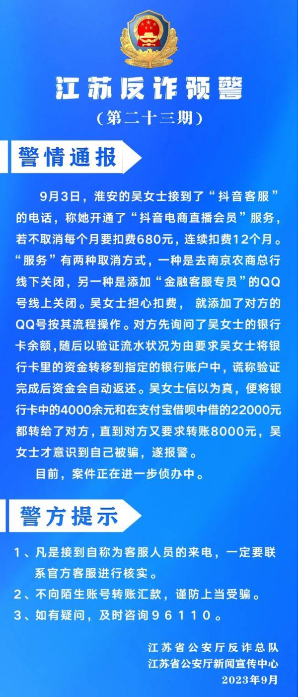 凡是自稱客服人員,以“抖音電商直播會(huì)員”不取消會(huì)自動(dòng)扣費(fèi)、影響征信為由,引導(dǎo)操作“轉(zhuǎn)賬匯款”的都是詐騙。切記,不要輕易向陌生賬號(hào)轉(zhuǎn)賬匯款,謹(jǐn)防上當(dāng)受騙。