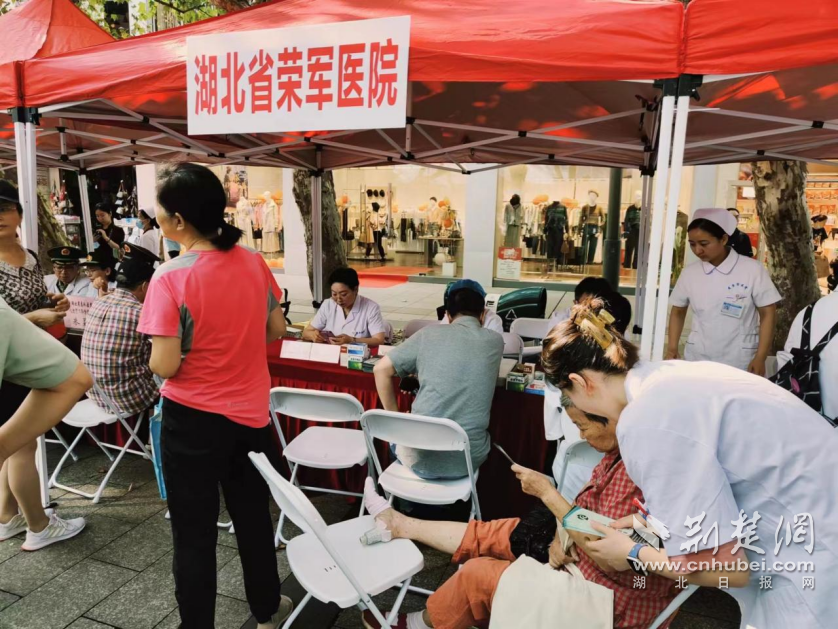 圖為省衛生健康委聯合武漢市衛生健康委、武昌區衛生健康局組織25家醫療衛生單位的150余名醫護人員,在武漢市武昌區水果湖步行街為市民提供免費診療和健康咨詢服務活動現場。通訊員供圖