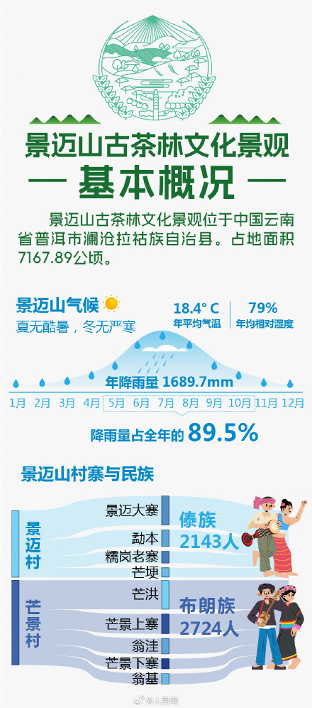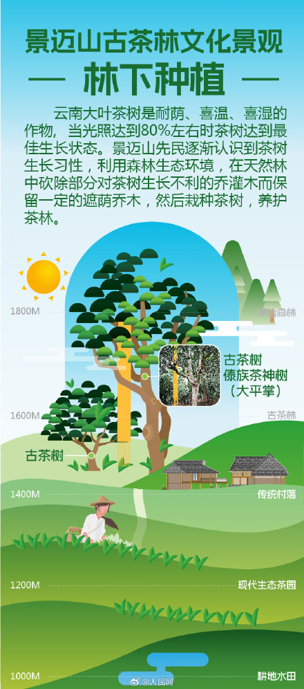 中國普洱景邁山古茶林文化景觀申遺成功,成為中國第57項世界遺產(chǎn)。它位于普洱市瀾滄拉祜族自治縣惠民鎮(zhèn)景邁山上,平均海拔高度在1400 米左右,十分適合普洱茶生長。戳圖一起來了解布朗族與傣族等世居民族歷經(jīng)千年,保護與發(fā)展形成的林茶共生、人地和諧的古茶林文化景觀。(人民網(wǎng))