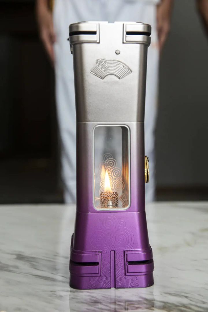 火種燈的創意源于中國古代提燈,方圓嵌套,頭尾刻有玉琮紋樣,顏色呈金色與紫色漸變。