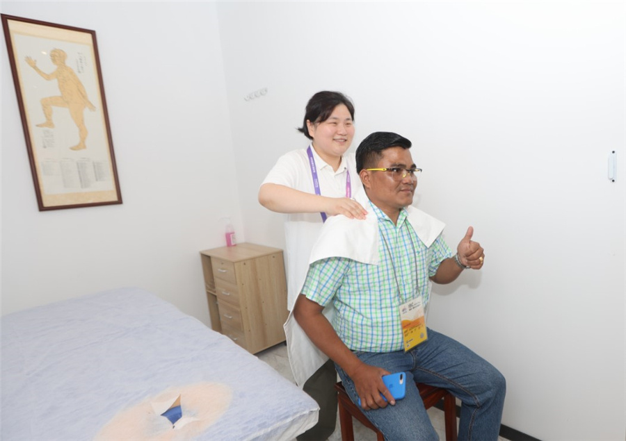 在生活服務區,令參訪團成員印象頗深的是中醫藥文化體驗館,他們體驗了推拿、八段錦。這些服務深受大家歡迎和好評,不僅讓人身心得到放松,更是對中醫藥文化的一次深入了解和體驗。