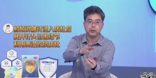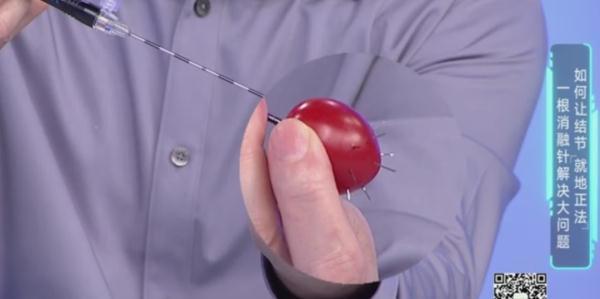 丁醫(yī)生現(xiàn)場(chǎng)展示射頻消融針的工作原理,以番茄作為結(jié)節(jié)來(lái)演示——