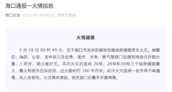 央視網消息:據“海口應急”微信公眾號消息,9月18日00時49分,位于海口市龍華區解放東路臨街鋪面發生火災。接警后,消防、公安、龍華區以及應急、醫療、水務、燃氣等部門迅速到場進行撲救處置,3時許,明火被撲滅。本次火災共造成26號、28號和30號三個臨街鋪面著火,著火物質為日雜百貨,過火面積約180平方米。此次火災造成一名市民不幸遇難,無人員受傷。火災具體原因,相關部門已著手開展調查。