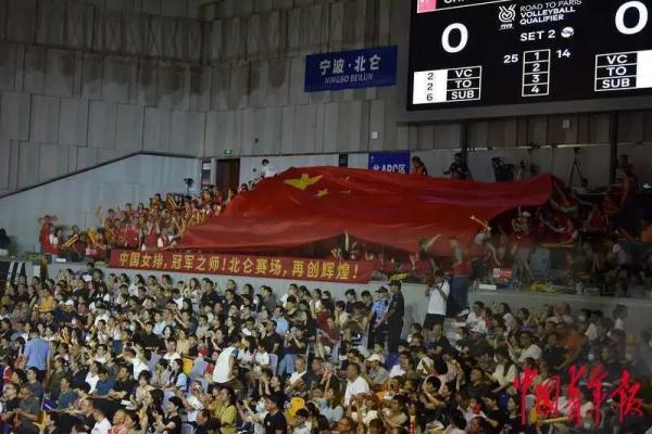比賽現(xiàn)場氣氛熱烈,圖為觀眾席上展示的一面巨大的國旗。中青報·中青網(wǎng)記者慈鑫攝