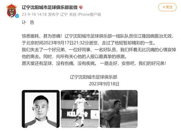 9月18日,遼寧沈陽城市足球俱樂部官微發布訃告:一線隊隊員任江隆去世。