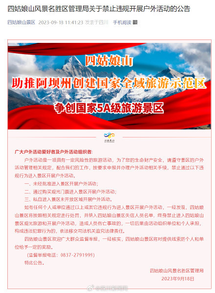 9月18日,“四姑娘山景區“官方微信發布公告:戶外活動是一項具有一定風險性的旅游活動,為了您的生命財產安全,請遵守景區的戶外活動管理相關規定,配合我們的工作,按要求申報并辦理戶外活動相關手續,禁止通過以下違規行為進入景區開展戶外活動。