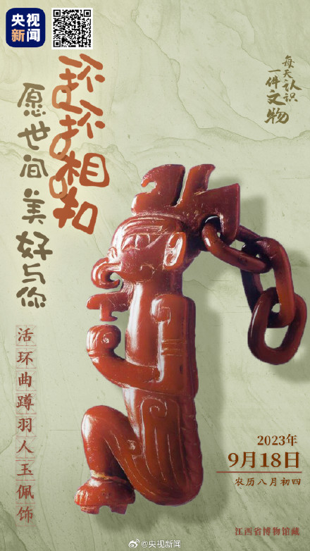 商代活環(huán)曲蹲羽人玉佩飾,是迄今發(fā)現(xiàn)最早的玉羽人。它的相貌亦人亦鳥,側(cè)身屈臂蹲坐,有著“臣”字目、鳥喙形嘴、“C”形大耳,頭頂后方連系3個相套的鏈環(huán)。當(dāng)時的先民,把羽人作為始祖或神人頂禮膜拜;到了兩漢時期,羽人忙了起來,頻繁出現(xiàn)在畫像石、青銅器、銅鼓中,他們或跳舞劃船、或?qū)牧⒒蝌T馬翱翔,可以說是多才多藝了。