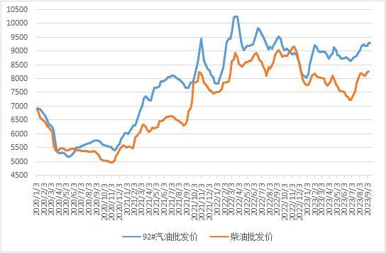 圖表:中國(guó)汽柴油批發(fā)價(jià)格指數(shù)周度均價(jià)走勢(shì)圖(單位:元/噸)