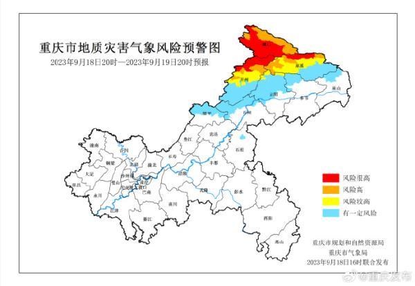 央視網消息:據@重慶發布 微博消息,9月18日16時,重慶市規劃和自然資源局、重慶市氣象局聯合發布全市地質災害氣象風險預警。9月18日20時至9月19日20時,開州區、巫溪縣、城口縣屬于風險很高地區,地質災害氣象風險等級為I級(紅色預警),云陽縣屬于風險較高地區,地質災害氣象風險等級為III級(黃色預警),萬州區、梁平區、奉節縣、巫山縣、石柱縣屬于有一定風險地區,地質災害氣象風險等級為IV級(藍色預警)。