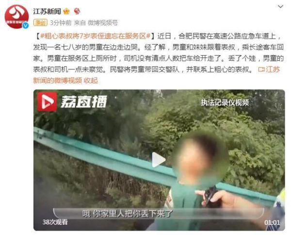 近日,合肥民警在高速公路應急車道上,發現一名七八歲的男童在邊走邊哭。經了解,男童和妹妹跟著表叔,乘長途客車回家。男童在服務區上廁所時,司機沒有清點人數把車給開走了。丟了個娃,男童的表叔和司機一點未察覺。民警將男童帶回交警隊,并聯系上粗心的表叔。