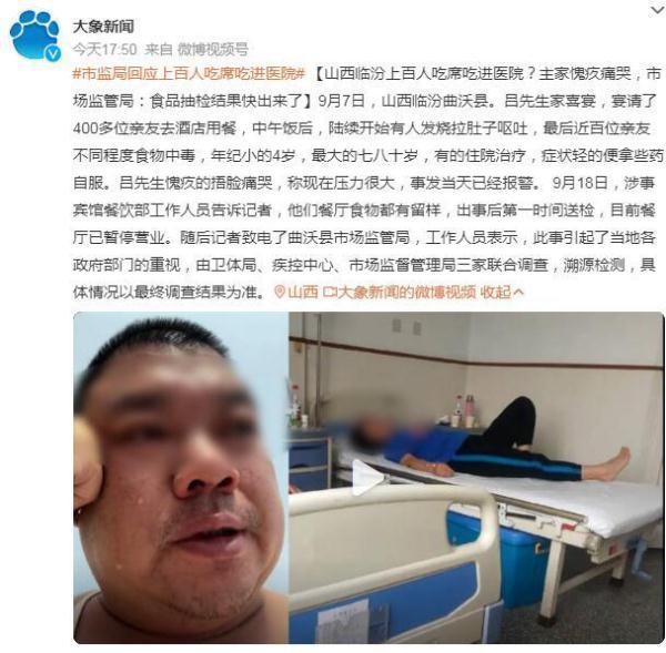 9月7日,山西臨汾曲沃縣。呂先生家喜宴,宴請了400多位親友去酒店用餐,中午飯后,陸續(xù)開始有人發(fā)燒拉肚子嘔吐,最后近百位親友不同程度食物中毒,年紀(jì)小的4歲,最大的七八十歲,有的住院治療,癥狀輕的便拿些藥自服。呂先生愧疚的捂臉痛哭,稱現(xiàn)在壓力很大,事發(fā)當(dāng)天已經(jīng)報(bào)警。 9月18日,涉事賓館餐飲部工作人員告訴記者,他們餐廳食物都有留樣,出事后第一時(shí)間送檢,目前餐廳已暫停營業(yè)。隨后記者致電了曲沃縣市場監(jiān)管局,工作人員表示,此事引起了當(dāng)?shù)馗髡块T的重視,由衛(wèi)體局、疾控中心、市場監(jiān)督管理局三家聯(lián)合調(diào)查,溯源檢測,具體情況以最終調(diào)查結(jié)果為準(zhǔn)。
