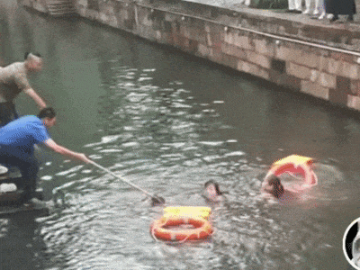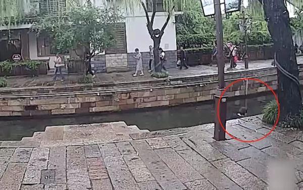9月16日16時許,南潯古鎮景區人群中傳來一陣驚呼聲,一名女子失足跌入河中。路邊群眾見狀,連忙將岸邊的救生器具扔入河中,但落水女子因慌亂和不勝水力,無法進行自救。