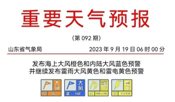 山東省氣象臺于9月19日6時發布海上大風橙色和內陸大風藍色預警并繼續發布雷雨大風黃色和雷電黃色預警。