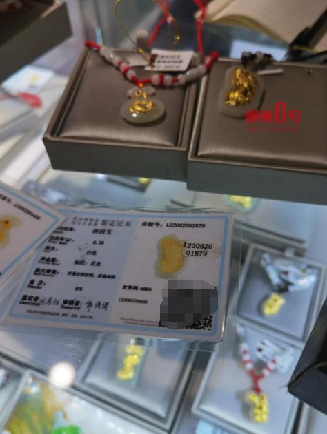 當記者問珠寶是真的嗎?女子當即稱,都是有“鑒定證書”的,隨即將“鑒定證書”遞給記者查看。只見上面寫著鑒定結果為“和田玉”,總質量8.38克,貴金屬標注“足金”。