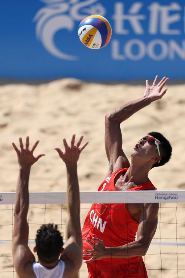 9月19日,中國選手王延偉(右)在浙江寧波進行的杭州亞運會沙灘排球男子小組賽E組比賽中扣球。最終,中國組合王延偉/李杰以2比0戰勝巴勒斯坦組合阿卜杜拉·阿爾坎/易卜拉欣·卡西亞。新華社記者 陳斌 攝