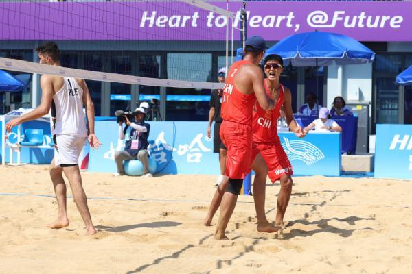 9月19日,中國選手王延偉(右一)和李杰(右二)在浙江寧波進行的杭州亞運會沙灘排球男子小組賽E組比賽中慶祝。最終,中國組合王延偉/李杰以2比0戰勝巴勒斯坦組合阿卜杜拉·阿爾坎/易卜拉欣·卡西亞。新華社記者 張濤 攝