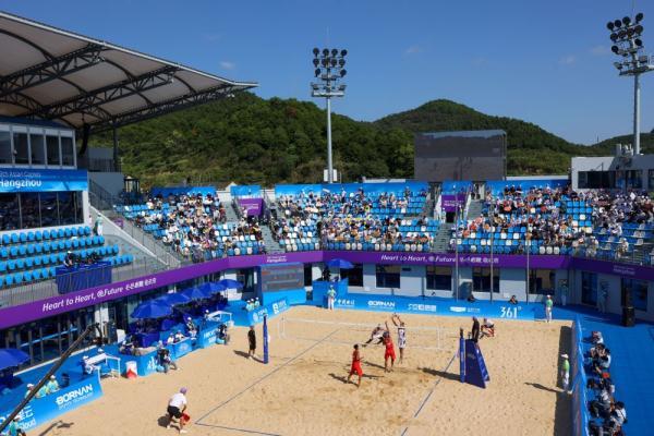 (新華全媒+)(7)杭州亞運會迎來首個比賽日當日,杭州亞運會迎來首個比賽日,沙灘排球、排球、板球、足球率先開賽,展開角逐。