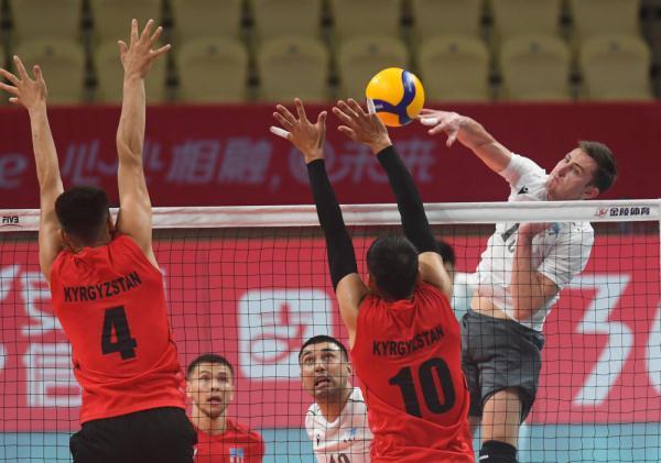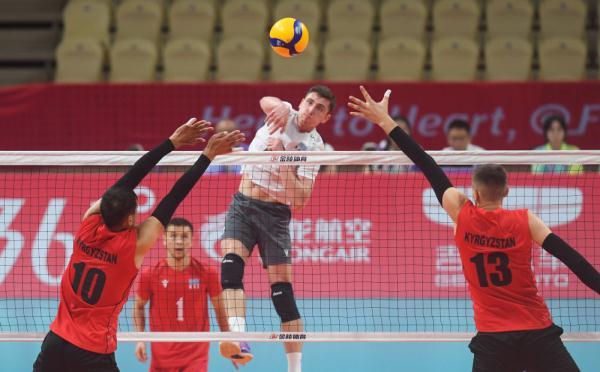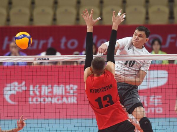9月19日,哈薩克斯坦隊球員昆琴科(上)在浙江省紹興市舉行的杭州亞運會男排小組賽A組比賽中扣球。最終,哈薩克斯坦隊以3比2戰勝吉爾吉斯斯坦隊。新華社記者 翁忻旸 攝