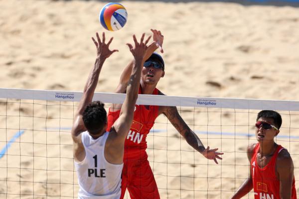 9月19日,中國組合王延偉/李杰(前)和巴勒斯坦組合易卜拉欣·卡西亞/阿卜杜拉·阿爾坎在浙江寧波進行的杭州亞運會沙灘排球男子小組賽E組比賽中。最終,中國組合王延偉/李杰以2比0取得勝利。新華社記者 張濤 攝