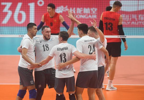 9月19日,哈薩克斯坦隊球員在浙江省紹興市舉行的杭州亞運會男排小組賽A組比賽中慶祝得分。最終,哈薩克斯坦隊以3比2戰勝吉爾吉斯斯坦隊。新華社記者 翁忻旸 攝