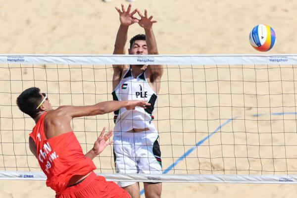 9月19日,巴勒斯坦選手阿卜杜拉·阿爾坎(右)在浙江寧波進行的杭州亞運會沙灘排球男子小組賽E組比賽中攔網。最終,中國組合王延偉/李杰以2比0戰勝巴勒斯坦組合阿卜杜拉·阿爾坎/易卜拉欣·卡西亞。新華社記者 張濤 攝