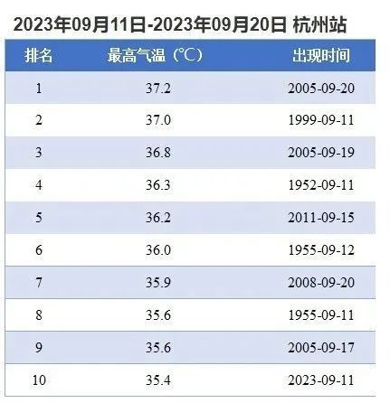 歷史上,杭州9月中旬的最高氣溫記錄是2005年9月20日的37.2℃,第二熱的是1999年的37℃,第三是2005年9月19日的36.8℃。按照今天的升溫情況,很可能沖上9月中旬歷史前十、歷史同日第二。