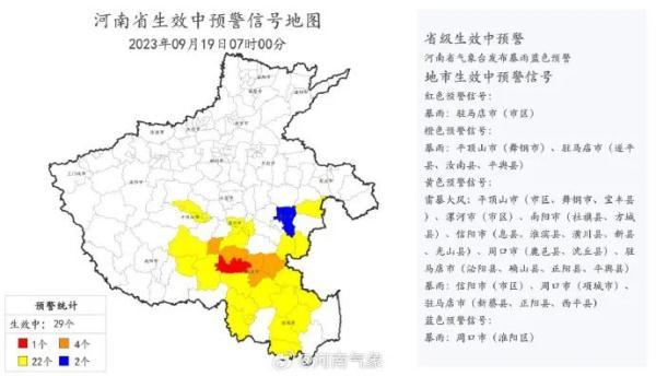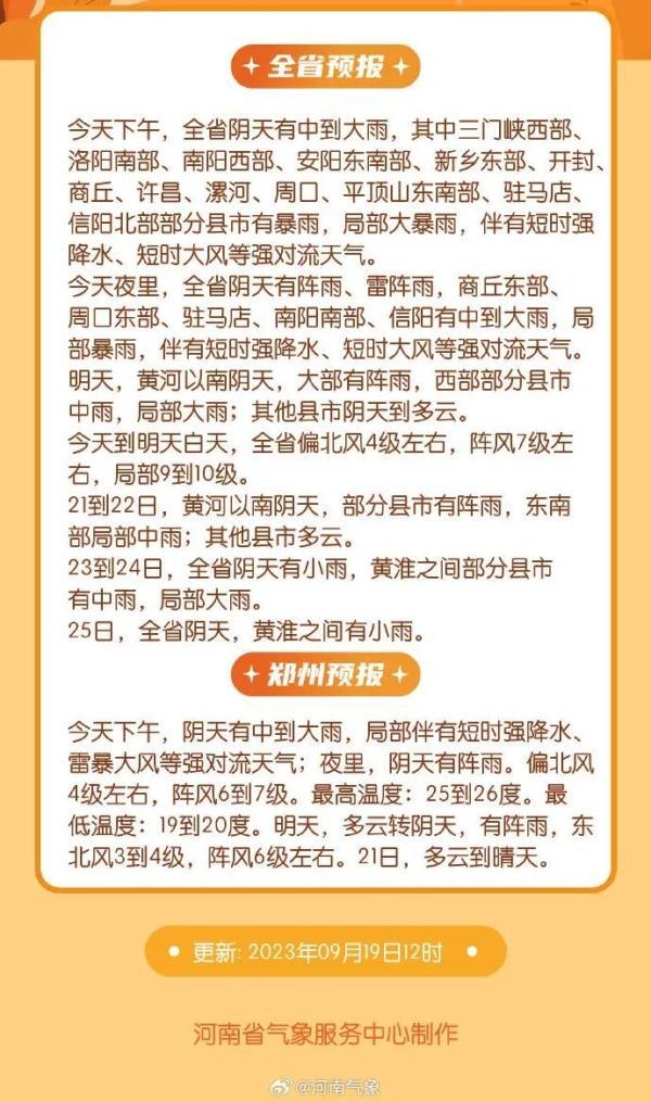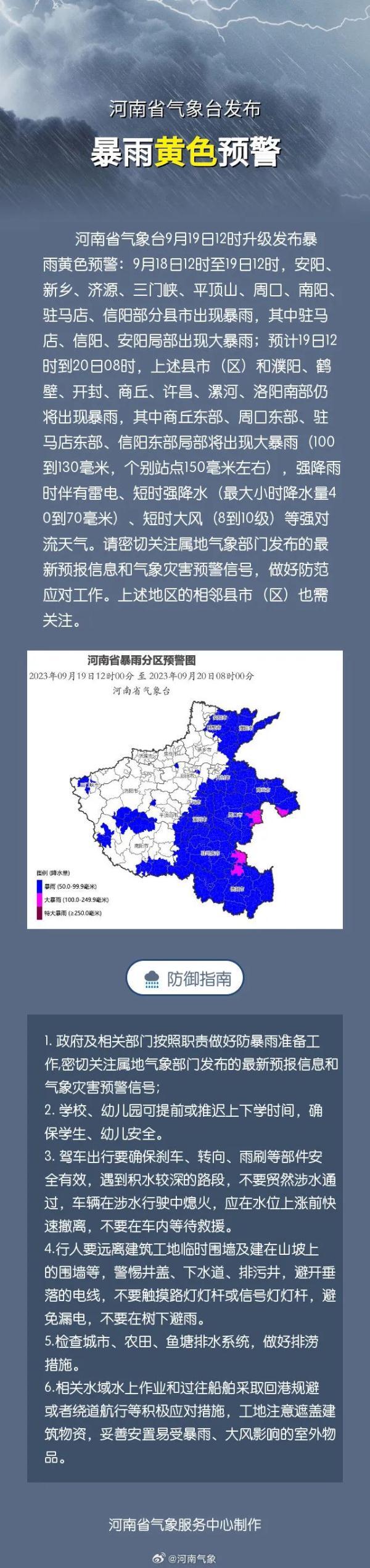 預計今天下午,全省有中到大雨,其中三門峽西部、洛陽南部、南陽西部、安陽東南部、新鄉(xiāng)東部、開封、商丘、許昌、漯河、周口、平頂山東南部、駐馬店、信陽北部部分縣市有暴雨,局部大暴雨,伴有短時強降水、短時大風等強對流天氣。