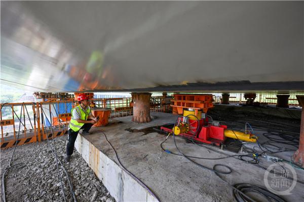 為減少對生態環境的破壞,項目采用了步履式頂推的施工工藝,在大橋的一端將橋體拼裝起來后,用步履式頂推器將其整體向大橋的另一端運送。