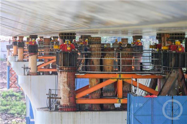 梅同輝說,實施過程中,頂推支墩搭設在既有橋墩上,臨時跨徑大、技術難度高、實施工藝復雜。工程師經過多次測算,計算出每個橋墩的受力范圍。“整個大橋項目一共使用了27個頂推機,設備的同步性是頂推工作的重難點。”