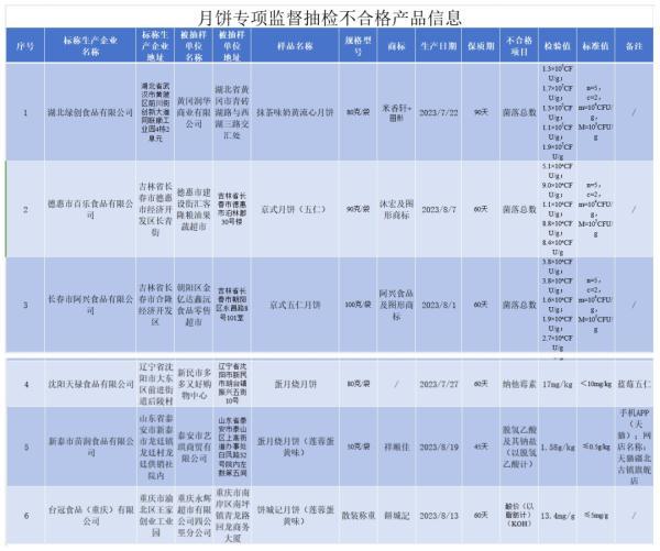 1.湖北省黃岡潤華商業(yè)有限公司銷售的、標稱湖北綠創(chuàng)食品有限公司生產(chǎn)的“米香軒”牌抹茶味奶黃流心月餅,其中菌落總數(shù)不合格。