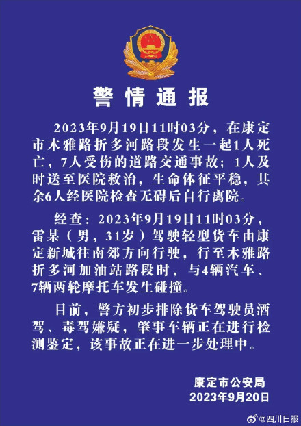 經查:2023年9月19日11時03分,雷某(男,31歲)駕駛輕型貨車由康定新城往南郊方向行駛,行至木雅路折多河加油站路段時,與4輛汽車、7輛兩輪摩托車發生碰撞。目前,警方初步排除貨車駕駛員酒駕、毒駕嫌疑,肇事車輛正在進行檢測鑒定,該事故正在進一步處理中。(康定正警事兒)