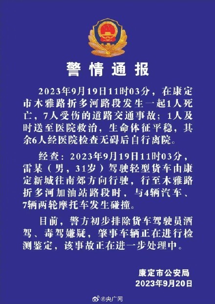 2023年9月19日11時(shí)03分,在康定市木雅路折多河路段發(fā)生一起1人死亡,7人受傷的道路交通事故;1人及時(shí)送至醫(yī)院救治,生命體征平穩(wěn),其余6人經(jīng)醫(yī)院檢查無(wú)礙后自行離院。經(jīng)查:2023年9月19日11時(shí)03分,雷某(男,31歲)駕駛輕型貨車(chē)由康定新城往南郊方向行駛,行至木雅路折多河加油站路段時(shí),與4輛汽車(chē)、7輛兩輪摩托車(chē)發(fā)生碰撞。目前,警方初步排除貨車(chē)駕駛員酒駕、毒駕嫌疑,肇事車(chē)輛正在進(jìn)行檢測(cè)鑒定,該事故正在進(jìn)一步處理中。(記者 蘇莉)