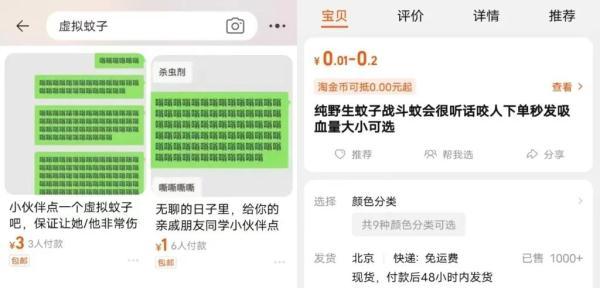 在電商平臺還有各種難以想象的無厘頭商品,比如“虛擬蚊子”,售價在1分錢到3元錢之間,商家宣稱可讓“蚊子”精準“咬人”。下單后商家會向指定社交賬號發送“嗡嗡嗡”來模擬蚊子振翅,還有配套的視頻及表情包,花的錢越多,“嗡”的時間越長。