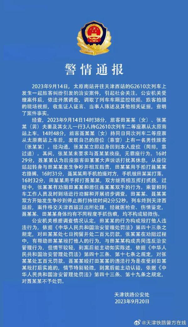 經(jīng)查,2023年9月14日14時(shí)38分,旅客田某某(女)、張某某(男)夫妻及其女兒一行3人持G2610次列車二等座票從太原南站上車。14時(shí)48分,旅客聶某某(女)持同日同次列車二等座票從太原南站上車后,發(fā)現(xiàn)自己的座位(靠窗)上有一名男性旅客(張某某)。經(jīng)溝通,張某某立即起身回到本人座位(同排,靠過道)。其間,張某某未要求與聶某某換座,無霸座行為。16時(shí)29分,聶某某認(rèn)為后座旅客田某某大聲說話打擾其休息,從座位站起轉(zhuǎn)身與田某某發(fā)生爭吵并相互指責(zé),田某某用手拍打聶某某右胳膊。16時(shí)31分,聶某某用手機(jī)拍攝對(duì)方,手機(jī)被田某某打落。16時(shí)32分,田某某用手揮打聶某某,雙方繼而相互揮打抓撓。過程中,張某某有勸阻田某某和摁住聶某某雙手的行為。乘警和列車工作人員及時(shí)到場進(jìn)行勸解和開展初步調(diào)查。田某某、聶某某雙方開始發(fā)生爭吵到停止撕打持續(xù)時(shí)間2分52秒。列車終到天津西站后,案件移交天津西站派出所處理。經(jīng)就醫(yī)檢查、傷情鑒定,聶某某、田某某身體均有不同程度手抓傷痕,均不構(gòu)成輕微傷。