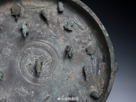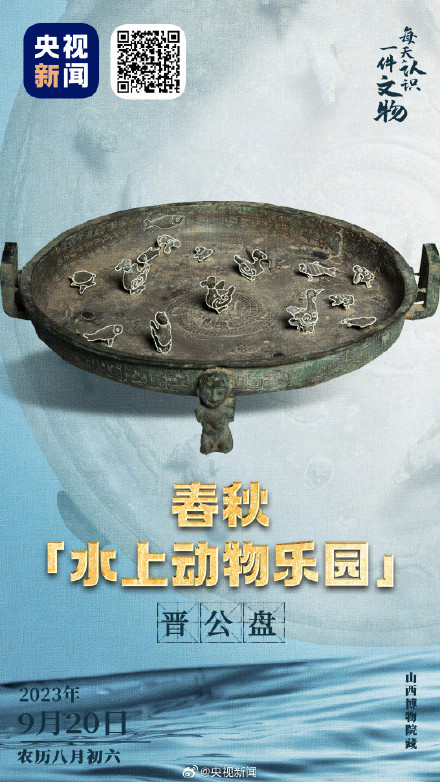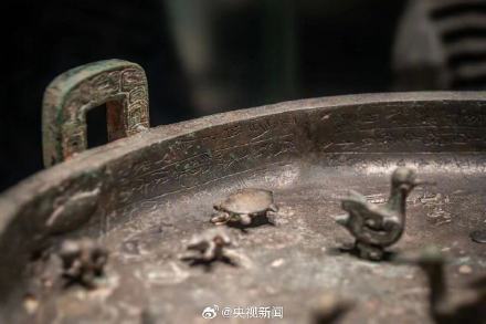 春秋時期,晉文公為愛女孟姬“定制”了一只青銅盤作為嫁妝。這是一件盥器,與匜配合,用于盥洗。盤上飾有鳥、龜、魚、蛙等19個圓雕動物,均可360度旋轉,鳥嘴可開合、鱉頭能伸縮,設計精妙,趣味十足。此外,盤內壁還有共183字的銘文,彰顯了盛世氣象,也記錄著拳拳父愛。