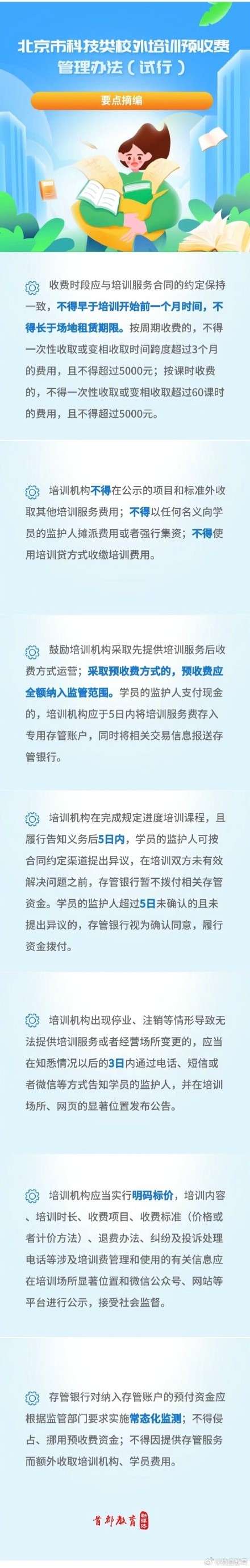 日前,《北京市科技類校外培訓預收費管理辦法(試行)》印發,明確科技類校外培訓預收費應全額納入監管,機構收費時段不得早于培訓開始前1個月,不得一次性收取時間跨度超過3個月或60課時的費用,且不超過5000元。@首都教育