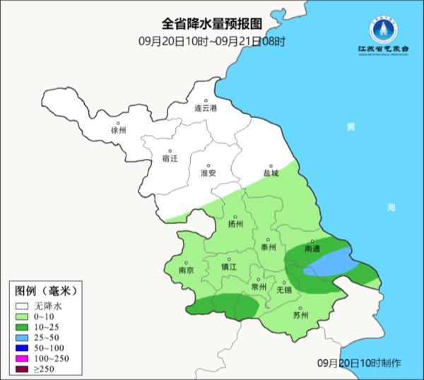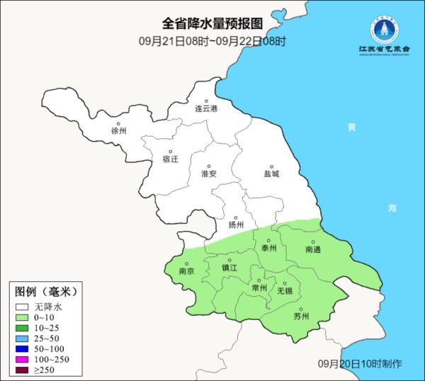 9月21日08時至9月22日08時,沿江和蘇南地區陰有陣雨,其他地區多云。