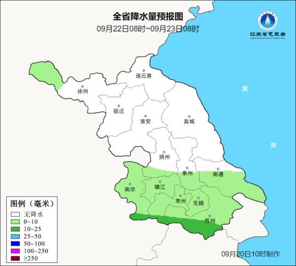 9月22日08時至9月23日08時,本省西北部地區和沿江蘇南地區陰有陣雨,其中蘇南南部部分地區雨量中等,其他地區多云。