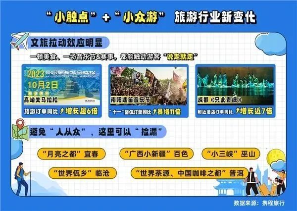 小而美的小眾目的地正在崛起。從電視劇《狂飆》帶火江門,到淄博燒烤、許昌胖東來,三四線城市成為今年旅游黑馬。“月亮之都”宜春、“廣西小新疆”百色、“小三峽”巫山等小而美的目的地可以讓游客在黃金周避開“人從眾”。