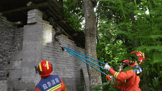 救援人員到達現場后,救援人員發現蟒蛇盤臥在石棉瓦檐與外墻之間的柱子上,目測大概有20斤,一副剛睡醒的模樣。救援人員立即在周圍做好警戒,并決定用捕蛇器夾住蟒蛇頭部,用拖拽的方式將其抓捕。救援人員三管齊下,用三個捕蛇器相互配合,將蟒蛇頭部牢牢鉗住。蟒蛇與救援人員暗暗較勁,救援人員快速上前掐住蟒蛇七寸,將其拖拽下來。