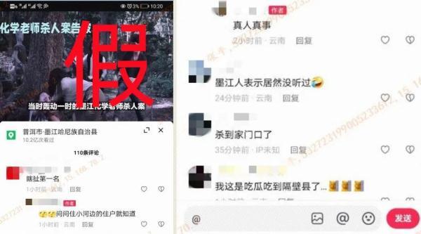 近日,有網(wǎng)民在某短視頻平臺(tái)發(fā)視頻稱“墨江化學(xué)老師殺人案告破”,并配文“墨江化學(xué)老師王富貴用絲襪殺人,對尸體侮辱后分尸,并將內(nèi)臟放在腌菜壇子里,此后他頻繁殺害絲襪女性。” 該視頻發(fā)布后,引發(fā)廣大網(wǎng)民熱議和關(guān)注,造成不良社會(huì)影響。發(fā)現(xiàn)該視頻后,普洱市墨江縣公安局網(wǎng)安大隊(duì)民警迅速開展工作,經(jīng)核實(shí),該視頻內(nèi)容為虛假信息。
