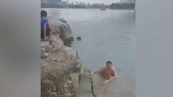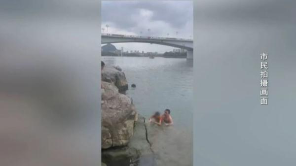 通過市民拍攝視頻中,救人的男子康俊峰,正拉著溺水的小男孩,緩緩上到岸邊,小男孩趴在石頭上氣喘吁吁,一旁還有他的兩個小伙伴。9月18日,記者見到了康俊峰和他的朋友鄭凱。他們回憶說,事情發生在16日下午3點左右,當時他們在江濱公園河岸邊喝茶,看到有三個孩子在護欄外的岸邊石頭上玩耍,其中一個不小心掉到了水里,很快就聽到了喊“救命”的呼喊聲。